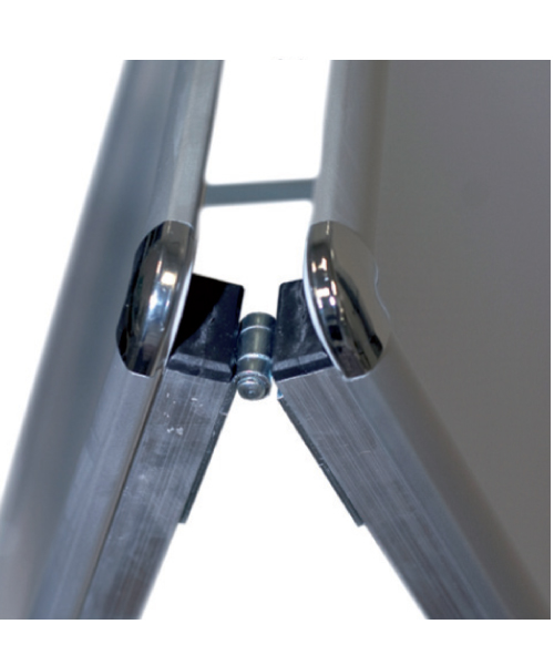 Lavagna a cavalletto bifacciale da interno realizzata in alluminio anodizzato con 4 bordi in plastica. Il prodotto è munito di cornice a scatto per l’alloggiamento delle stampe e di foglio antigraffio per la protezione delle grafiche. Il profilo della cornice ultrapiatta è di 2,5 cm.